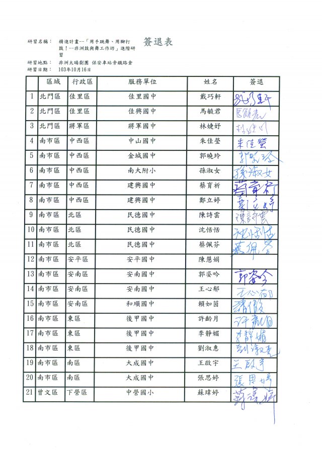 | 103 | 1031016非洲鼓舞進階研習簽到表-001.jpg | 顏玉坤 | 127 | ||