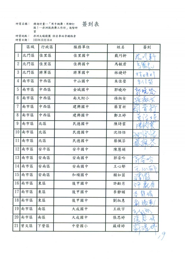 | 103 | 1031016非洲鼓舞進階研習簽到表_002.jpg | 顏玉坤 | 131 | ||