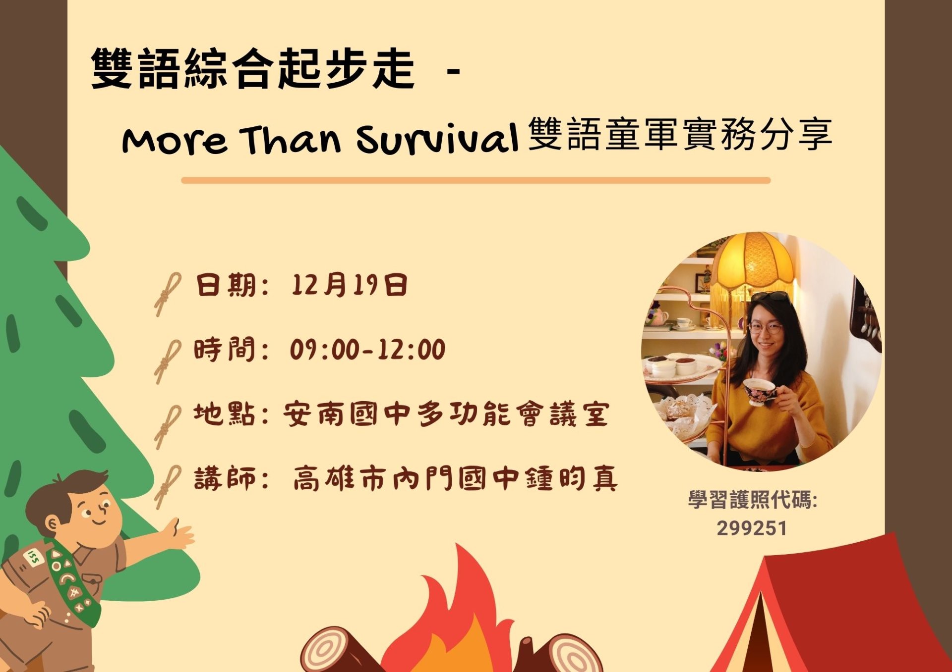 講師: 高雄市內門國中鍾昀真組長 課程內容 1. 雙語童軍課堂實踐分享 2. 雙語童軍備課&學習策略雙語童軍繩結實作 3. 綜合座談
