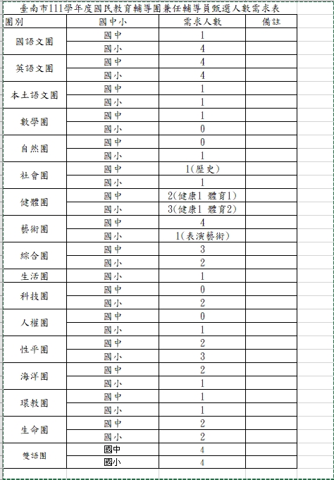 四、檢附「臺南市111學年度國民教育輔導團-兼任輔導員甄選簡章」1份及各領域及議題團需求人數表。