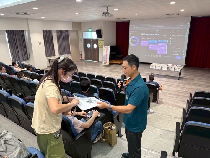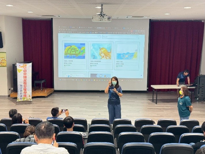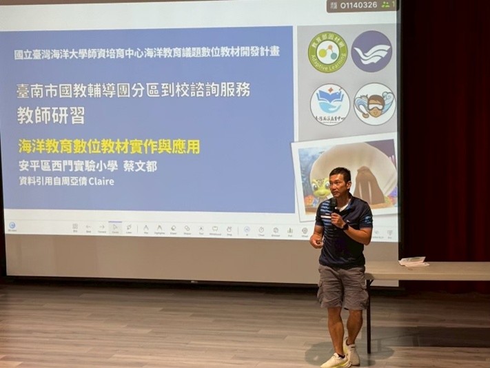 1. 海洋教育輔導團西門實小蔡文都主任進行海洋教育數位教材實作與應用的分享,以因材網「海洋鮮聞與數位融入示範-classpoint」為核心重點進行說明。